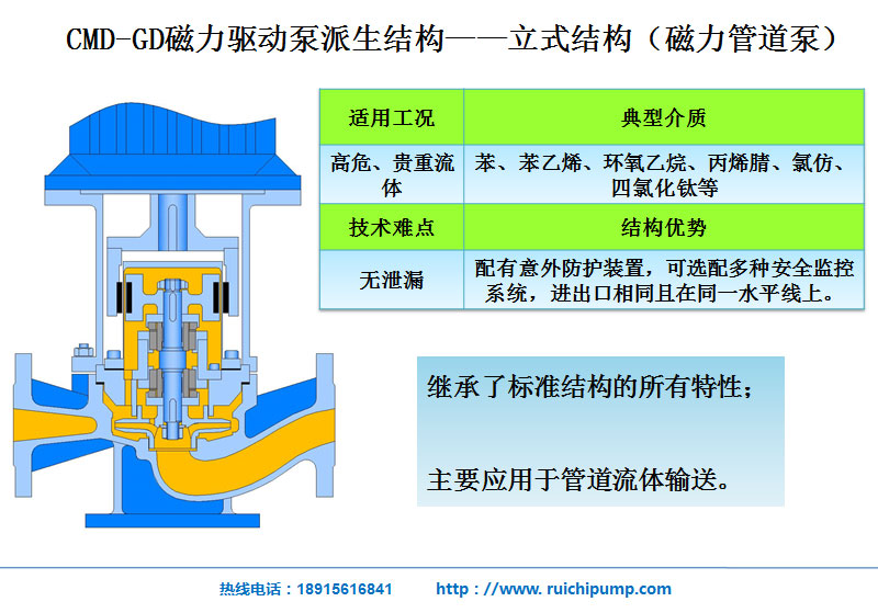 CMD-GD立式管道用途不锈钢(304、316、316L)磁力驱动泵产品特点: